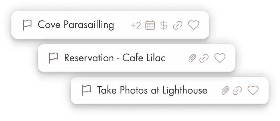 Import confirmations and attach them to the right day so you're both on the same page: dinner bookings, check-in notes, tickets.